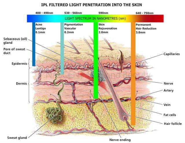 Механизмът на действие е следният: меланинът и оксихемоглобинът абсорбират много силно светлината, излъчвана от съответния накрайник на апарата за фотоподмладяване. Като за кратко време поемат голяма енергия, при което меланинът се „взривява” и излиза към повърхността под формата на малки тъмнокафяви или черни точици, а оксихемоглобинът коагулира от високата енергия /топлина/ и кръвоносният съд изчезва. След процедурата могат да се появят петна и там, където не ги е имало. Това е защото светлината изкарва на повърхността скритата пигментация – тази, която все още не се вижда, но след време ще се появи.