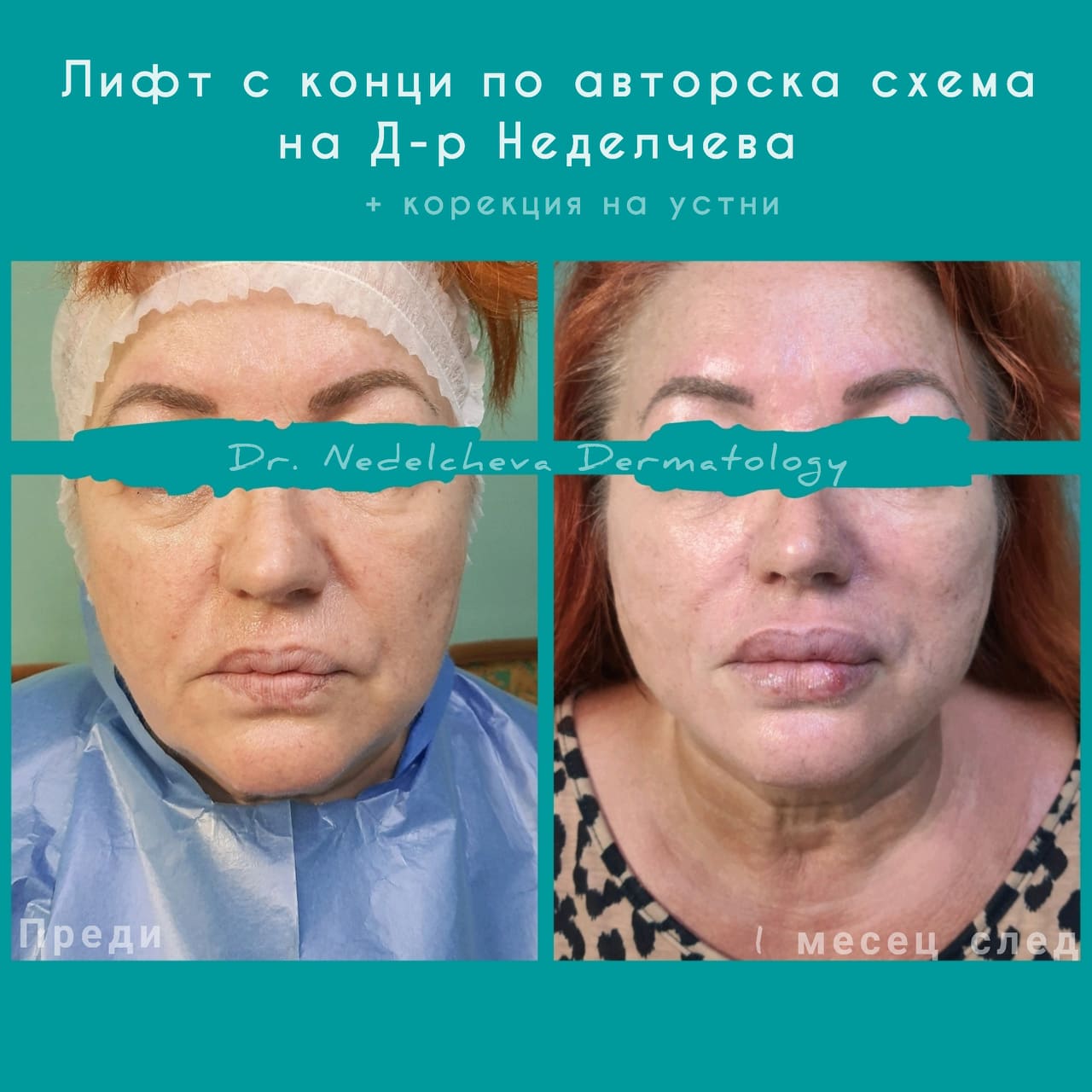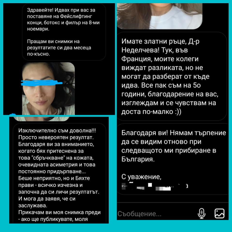 Д-р М.Неделчева беше един от първите лекари в България, които успяха да „усетят“ идващото блестящо бъдеще на „конците“ в процедурите за подмладяване още през 2013 г. И ако случайно вие сте от пациентите, които за първи път чуват за този метод, то сте попаднали на лекар с една изключително богата практика и опит в работата с абсолютно всички видове конци. Днес, толкова години по-късно, със стотици резултати зад гърба си и множество доволни пациенти, за Д-р М.Неделчева и нейната дъщеря Д-р А.Неделчева тази процедура е като „детска игра“. Разбира се, това е изключително трудна и специфична медицинска процедура и трябва да се извършва само от специализирани и специално обучени професионалисти